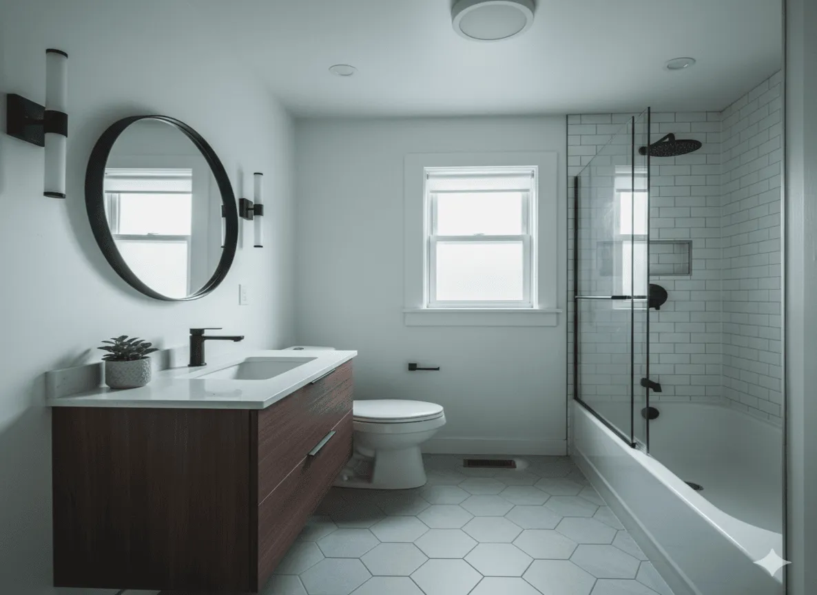 We focused on impact: fresh porcelain tile, a floating vanity, black fixtures, and an LED mirror that instantly modernized the room.