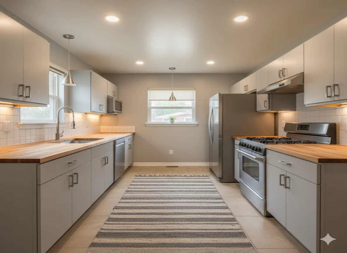 Instead of tearing everything out, we upgraded key focal points: new flooring, modern matte fixtures, LED under-cabinet lighting, and clean white uppers to lift the room visually.