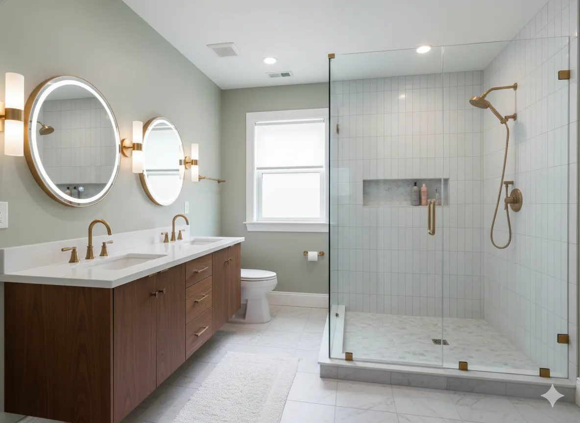 A frameless glass shower replaced the bulky tub, quartz counters brightened the vanity, and new lighting lifted the entire room.