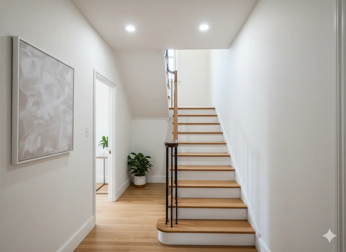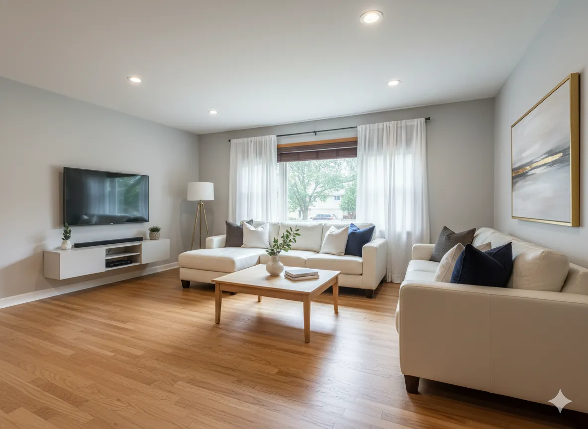 We removed two interior walls, installed wide-plank hardwood, upgraded lighting, and introduced a modern color palette.