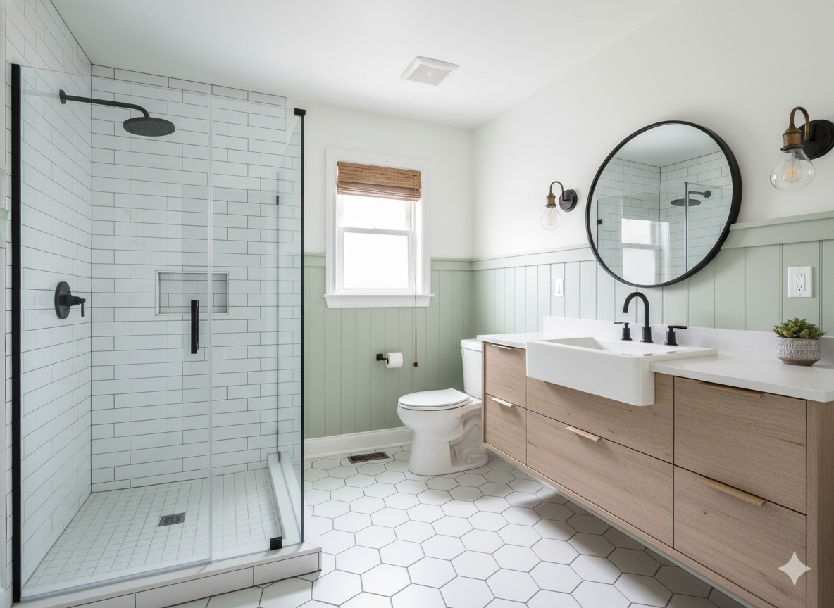 This client loved the size of their bathroom but hated the outdated finishes. Beige tiles, yellow lighting, and a tired vanity dominated the space.